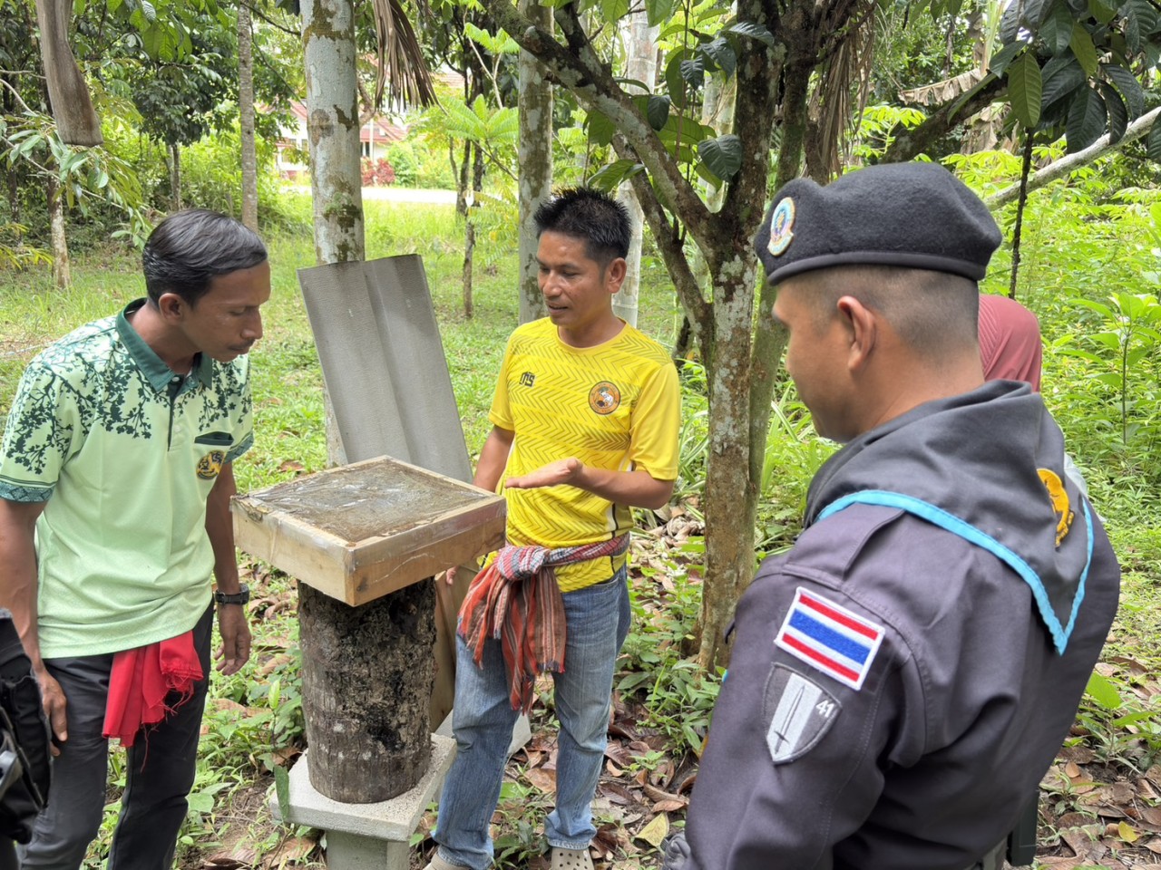 หน่วยเฉพาะกิจกรมทหารพรานที่ 41 โดยชุดปฏิบัติการกิจการพลเรือน กองร้อยทหารพรานที่ 4103 ลงพื้นที่พบปะพูดคุยกับกลุ่มผู้เลี้ยงผึ้งชันโรง ณ บ้านเลขที่ 166 บ้านทำนบ หมู่ที่ 3 ตำบลกาลอ อำเภอรามัน จังหวัดยะลา เป็นการแลกเปลี่ยนเรียนรู้วิธีการเพาะเลี้ยงและเก็บรักษาน้ำผึ้งชันโรง ซึ่งเป็นอาชีพเสริมที่สร้างรายได้ให้กับประชาชนในชุมชน อีกทั้งยังช่วยส่งเสริมให้ครอบครัวมีความมั่นคงทางเศรษฐกิจ สามารถพึ่งพาตนเองได้อย่างยั่งยืน