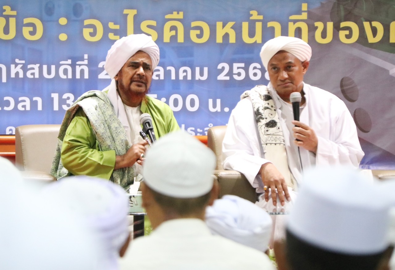 พร้อมกันนี้ ท่านฮาบีบอุมัร มูฮัมหมัด ซาเล็ม บิน ฮาฟิส ได้บรรยายธรรมเกี่ยวกับการน้อมนำหลักศาสนาอิสลามที่ถูกต้องคือหนทางสู่ความสันติ ผู้นำที่ดี คือผู้นำที่ปฏิบัติตนอยู่ในหลักศาสนา และที่ยึดมั่นในความถูกต้อง เพื่อเป็นแบบอย่าง และแนวทางที่ดีให้กับประชาชนและพี่น้องมุสลิมในพื้นที่