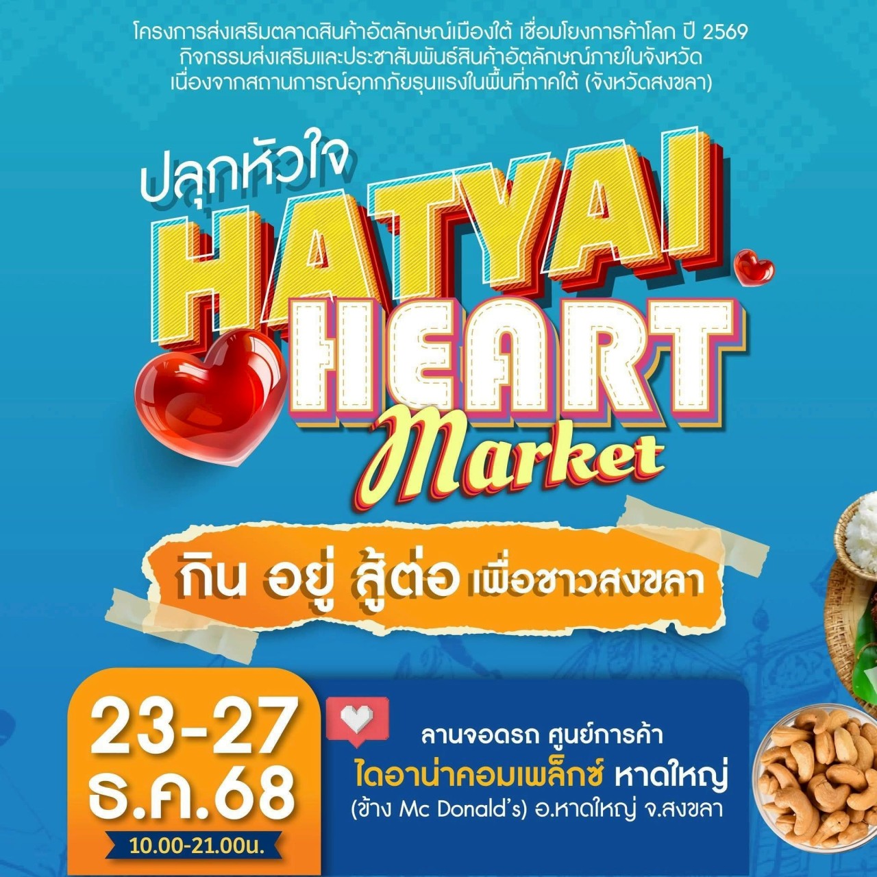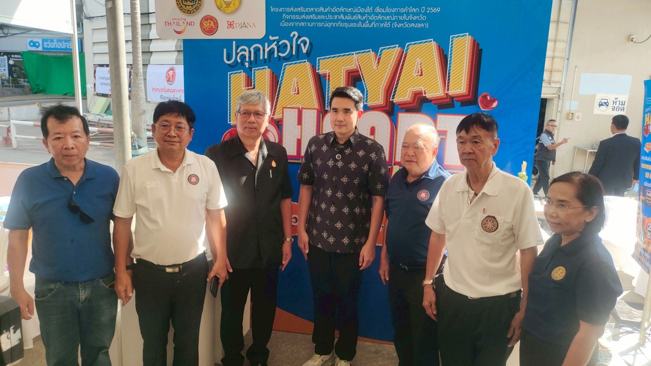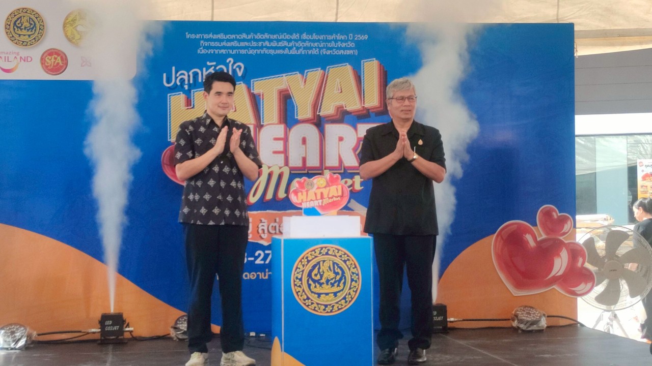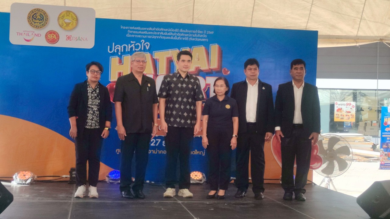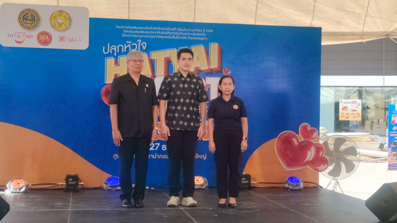 กระทรวงพาณิชย์ โดยสำนักงานพาณิชย์จังหวัดสงขลา จัดงาน “ปลุกหัวใจ HATYAI HEART MARKET กิน อยู่ สู้ต่อ เพื่อชาวสงขลา” งานแสดงและจำหน่ายสินค้าอัตลักษณ์ภายในจังหวัด ณ ลานจอดรถศูนย์การค้าไดอาน่าคอมเพล็กซ์ หาดใหญ่ อำเภอหาดใหญ่ จังหวัดสงขลา วันอังคารที่ 23 ธันวาคม 2568 เวลา 14.30 น. นายกรนิจ โนนจุ้ย ผู้ตรวจราชการกระทรวงพาณิชย์ เป็นประธานในพิธีเปิดงาน “ปลุกหัวใจ HATYAI HEART MARKET กิน อยู่ สู้ต่อ เพื่อชาวสงขลา” งานแสดงและ จำหน่ายสินค้าอัตลักษณ์ภายในจังหวัด ภายใต้คอนเซป “กิน อยู่ สู้ ต่อ เพื่อชาวสงขลา” ตามโครงการส่งเสริม ตลาดสินค้าอัตลักษณ์เมืองใต้ เชื่อมโยงการค้าโลก ปี 2569 กิจกรรมส่งเสริมและประชาสัมพันธ์สินค้าอัตลักษณ์ ภายในจังหวัด เนื่องจากสถานการณ์อุทกภัยรุนแรงในพื้นที่ภาคใต้ (จังหวัดสงขลา) พร้อมด้วย นายชูชีพ ธรรมเพชร รองผู้ว่าราชการจังหวัดสงขลา นางสาวฉัตร์สุดา ชุมแสง พาณิชย์จังหวัดสงขลา ร่วมด้วยหัวหน้าส่วนราชการ แขกผู้มีเกียรติ และสื่อมวลชน ณ ลานจอดรถศูนย์การค้า ไดอาน่าคอมเพล็กซ์ หาดใหญ่ อำเภอหาดใหญ่ จังหวัดสงขลา