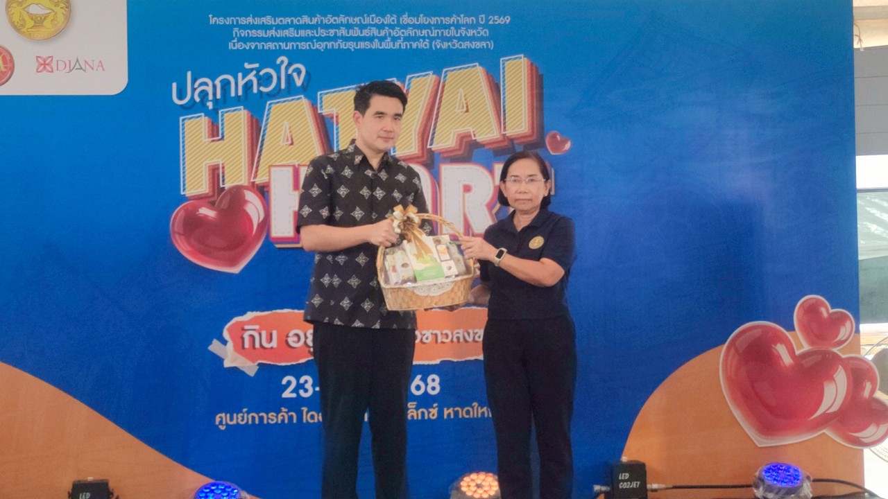 กิจกรรม ส่งเสริมและประชาสัมพันธ์สินค้าอัตลักษณ์ภายในจังหวัด เนื่องจากสถานการณ์อุทกภัยรุนแรงในพื้นที่ภาคใต้ (จังหวัดสงขลา) ระหว่างวันที่ 23 – 27 ธันวาคม 2568 ณ ลานจอดรถศูนย์การค้า ไดอาน่าคอมเพล็กซ์ หาดใหญ่ อำเภอหาดใหญ่ จังหวัดสงขลา