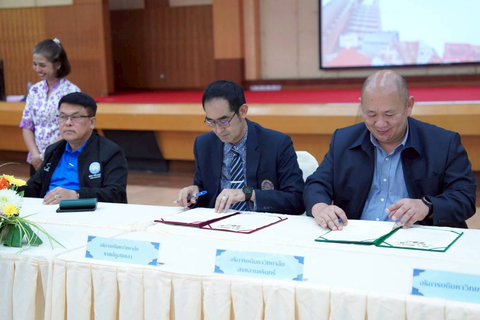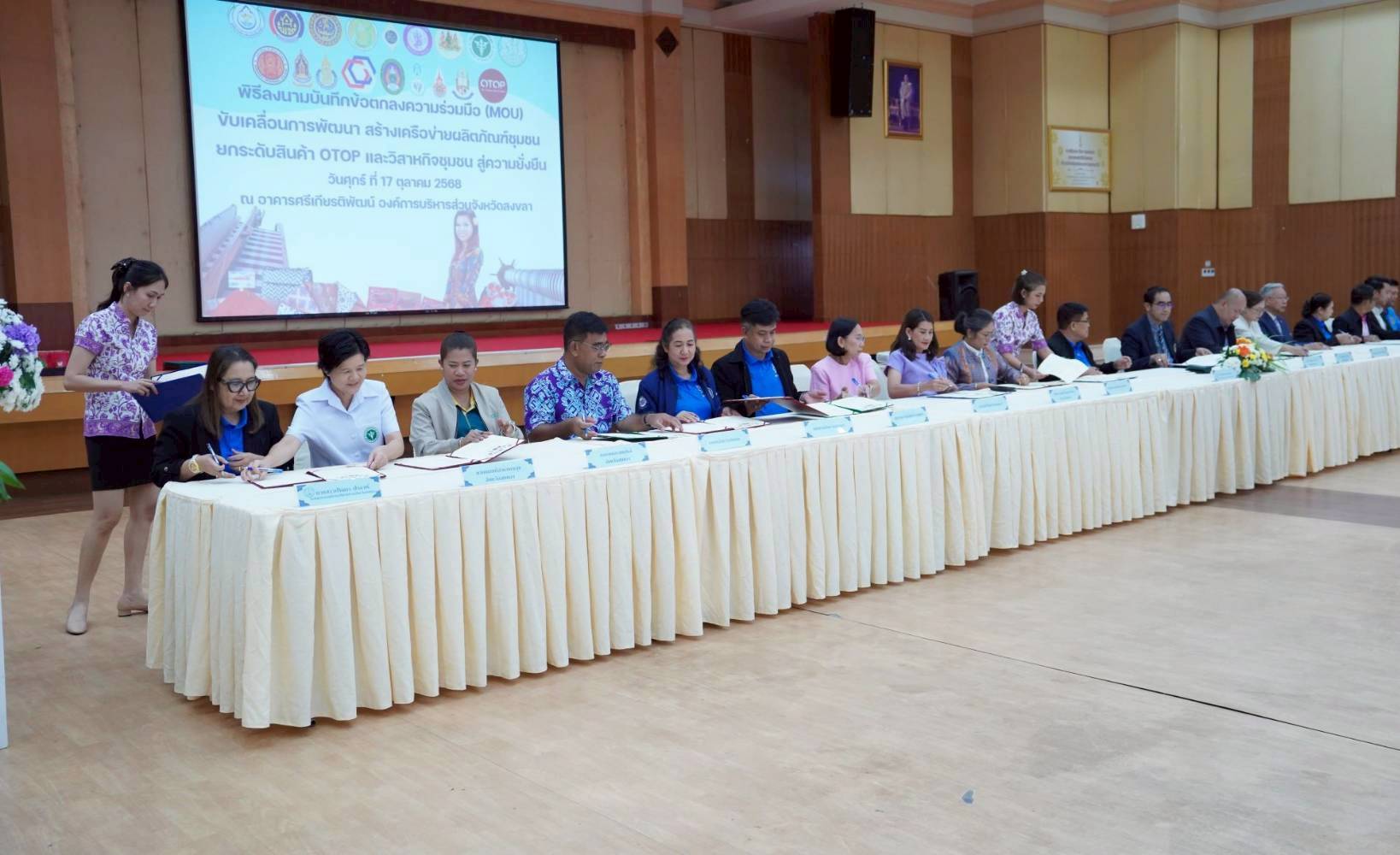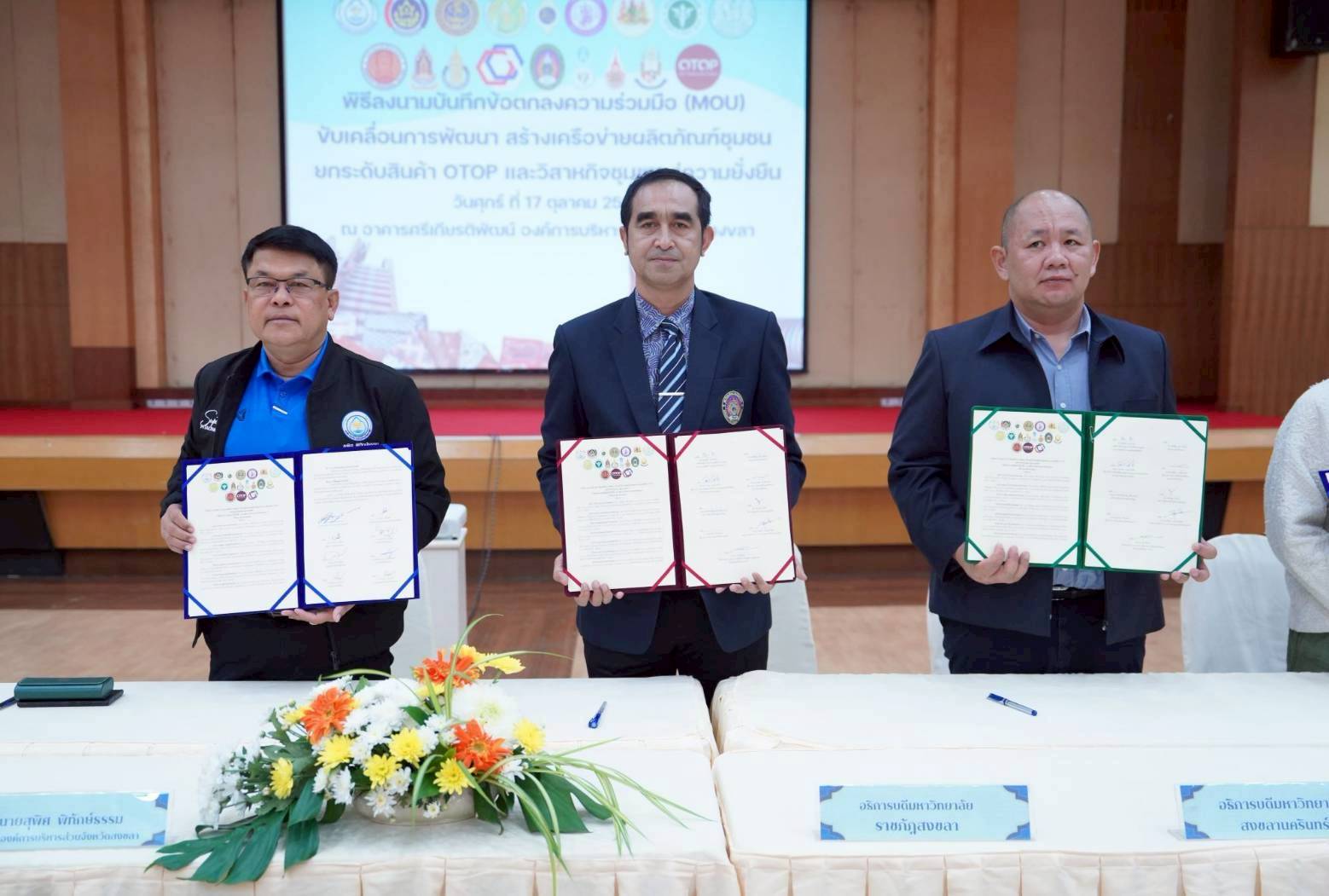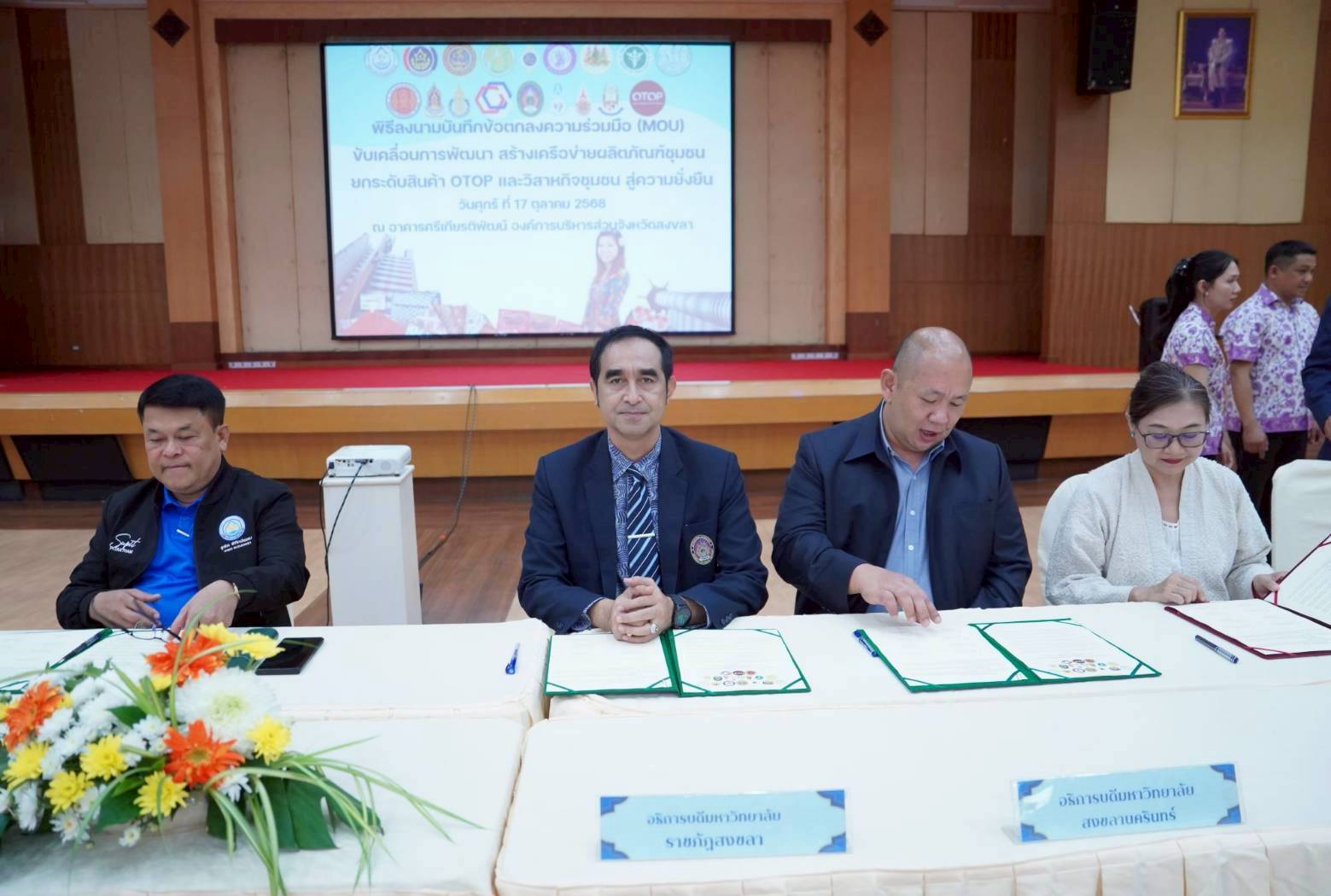 วันที่ 17 ตุลาคม 2568 ผศ.พิเชษฐ์ จันทวี อธิการบดีมหาวิทยาลัยราชภัฏสงขลา (มรภ.สงขลา) ลงนามบันทึกข้อตกลงความร่วมมือขับเคลื่อนการพัฒนา สร้างเครือข่ายผลิตภัณฑ์ชุมชน ยกระดับสินค้า OTOP และวิสาหกิจชุมชนสู่ความยั่งยืน ณ ห้องประชุมอาคารศรีเกียรติพัฒน์ องค์การบริหารส่วนจังหวัดสงขลา (อบจ.สงขลา) ร่วมกับ อบจ.สงขลา ซึ่งนำโดย นายสุพิศ พิทักษ์ธรรม นายก อบจ.สงขลา และองค์กรพันธมิตรอื่น ๆ ได้แก่ สำนักงานพัฒนาชุมชนจังหวัดสงขลา ประธานแม่บ้านมหาดไทยจังหวัดสงขลา สำนักงานพาณิชย์จังหวัดสงขลา สำนักงานอุตสาหกรรมจังหวัดสงขลา สำนักงานแรงงานจังหวัดสงขลา สำนักงานเกษตรจังหวัดสงขลา สำนักงานเกษตรและสหกรณ์จังหวัดสงขลา สำนักงานสาธารณสุขจังหวัดสงขลา สำนักงานวัฒนธรรมจังหวัดสงขลา มหาวิทยาลัยสงขลานครินทร์ มหาวิทยาลัยทักษิณ มหาวิทยาลัยหาดใหญ่ วิทยาลัยอาชีวศึกษาสงขลา เครือข่าย OTOP และกลุ่มอาชีพจังหวัดสงขลา และ บริษัทประชารัฐรักสามัคคีสงขลา (วิสาหกิจเพื่อชุมชน) จำกัด