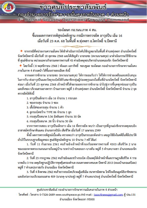 รองโฆษก กอ.รมน.ภาค 4 สน. ชี้แจงผลการตรวจพิสูจน์หลักฐาน กรณีการตรวจยึด อาวุธปืน เอ็ม 16 เมื่อวันที่ 23 ต.ค. 68 ในพื้นที่ ต.ทุ่งพลา อ.โคกโพธิ์ จ.ปัตตานี.