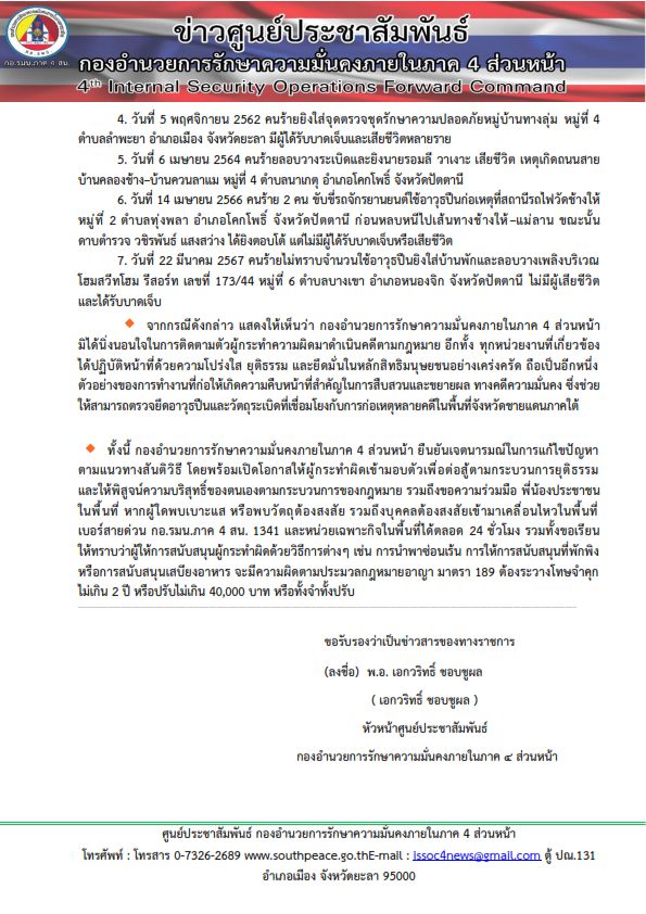 ทั้งนี้ กองอำนวยการรักษาความมั่นคงภายในภาค 4 ส่วนหน้า ยืนยันเจตนารมณ์ในการแก้ไขปัญหาตามแนวทางสันติวิธี โดยพร้อมเปิดโอกาสให้ผู้กระทำผิดเข้ามอบตัวเพื่อต่อสู้ตามกระบวนการยุติธรรม และให้พิสูจน์ความบริสุทธิ์ของตนเองตามกระบวนการของกฎหมาย รวมถึงขอความร่วมมือ พี่น้องประชาชนในพื้นที่ หากผู้ใดพบเบาะแส หรือพบวัตถุต้องสงสัย รวมถึงบุคคลต้องสงสัยเข้ามาเคลื่อนไหวในพื้นที่ เบอร์สายด่วน กอ.รมน.ภาค 4 สน. 1341 และหน่วยเฉพาะกิจในพื้นที่ได้ตลอด 24 ชั่วโมง รวมทั้งขอเรียนให้ทราบว่าผู้ให้การสนับสนุนผู้กระทำผิดด้วยวิธีการต่างๆ เช่น การนำพาซ่อนเร้น การให้การสนับสนุนที่พักพิง หรือการสนับสนุนเสบียงอาหาร จะมีความผิดตามประมวลกฎหมายอาญา มาตรา 189 ต้องระวางโทษจำคุกไม่เกิน 2 ปี หรือปรับไม่เกิน 40,000 บาท หรือทั้งจำทั้งปรับ