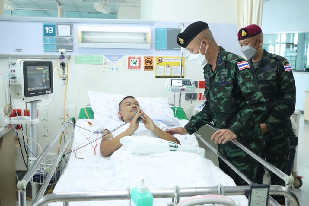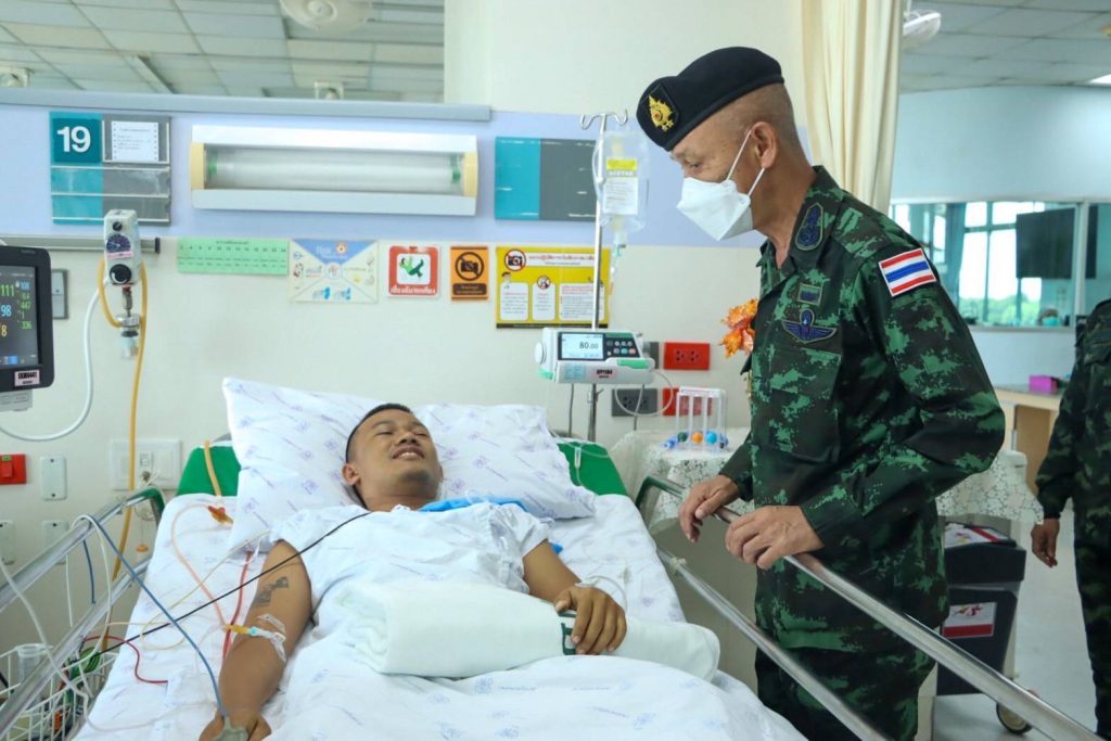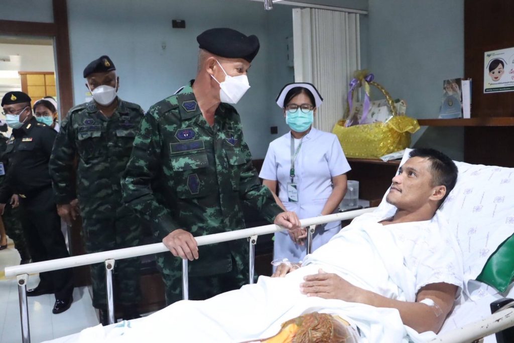 วันนี้ (7 ตุลาคม 2568) เวลา 11:00 น. ที่ โรงพยาบาลสงขลานครินทร์ อำเภอหาดใหญ่ จังหวัดสงขลา พลตรี กรกฎ ภู่โชติ รองแม่ทัพภาคที่ 4 / รองผู้อำนวยการรักษาความมั่นคงภายในภาค 4 ส่วนหน้า และคณะ ลงพื้นที่เข้าเยี่ยม สิบเอก บุริศวร์ ระดาชัย ผู้ได้รับบาดเจ็บจากเหตุการณ์ดังกล่าว ซึ่งได้มีการส่งตัวมาจากโรงพยาบาลสุไหงโก – ลก จังหวัดนราธิวาส มาทำการรักษาต่อที่โรง สงขลานครินทร์ ปัจจุบันทางทีมแพทย์ได้ทำการผ่าตัดนำกระสุนออกแล้ว หายใจโดยการใช้ออกซิเจน ความดันปกติ ไม่มีไข้ สามารถตอบโต้ได้ปกติ