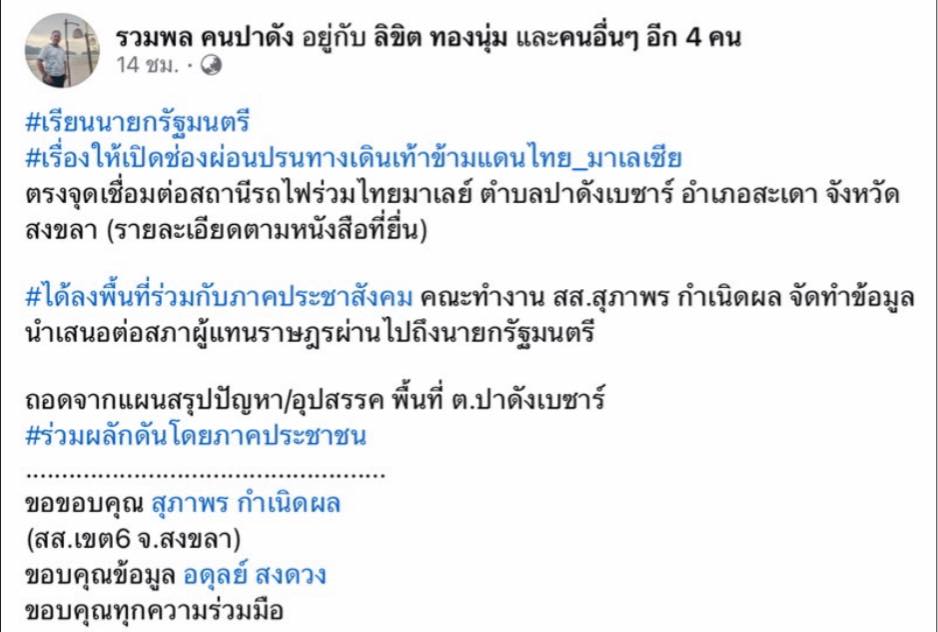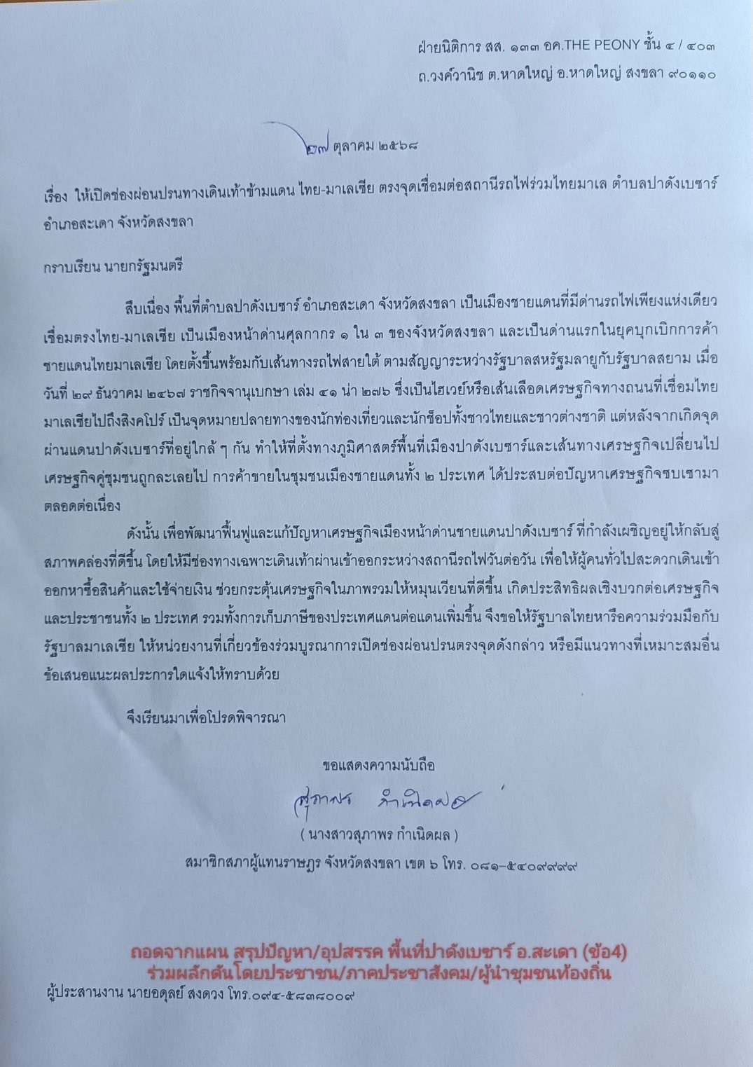 “สส.น้ำหอม” นางสาวสุภาพร กำเนิดผล สมาชิกสภาผู้แทนราษฎรจังหวัดสงขลา มอบหมายให้คณะทำงานลงพื้นที่ร่วมหารือกับภาคประชาสังคมและผู้แทนชุมชนในพื้นที่ อำเภอสะเดา จังหวัดสงขลา เพื่อร่วมกันหาแนวทาง ฟื้นฟูเศรษฐกิจเมืองชายแดนปาดังเบซาร์ ตามคำร้องขอให้ช่วยผลักดันเรื่อง “เปิดช่องผ่อนปรนทางเดินเท้าข้ามแดนไทย–มาเลเซีย” บริเวณจุดเชื่อมต่อสถานีรถไฟร่วมไทย–มาเลเซีย ตำบลปาดังเบซาร์