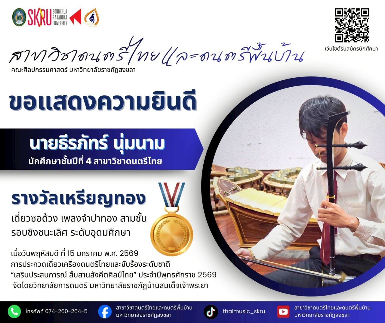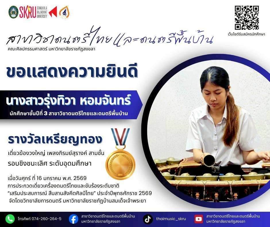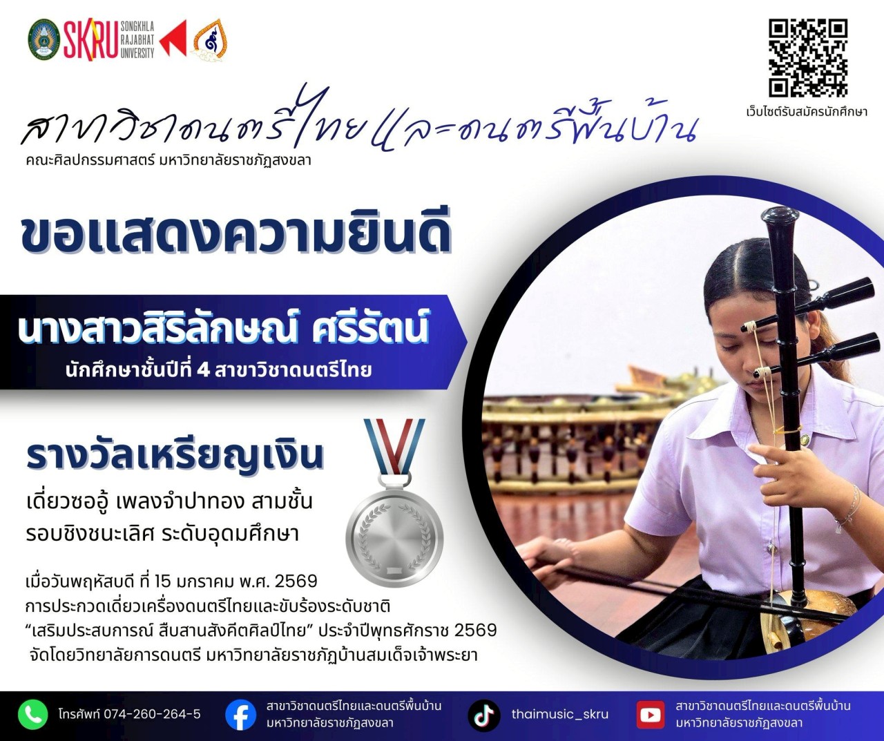 นักศึกษาดนตรีไทยและดนตรีพื้นบ้าน คณะศิลปกรรมฯ มรภ.สงขลา โชว์ผลงานยอดเยี่ยม แทคทีมคว้า 3 เหรียญทอง 1 เหรียญเงิน เวทีประกวดเดี่ยวเครื่องดนตรีไทยและขับร้องระดับชาติ “เสริมประสบการณ์ สืบสานสังคีตศิลป์ไทย” ประจำปี 2569 ณ มรภ.บ้านสมเด็จเจ้าพระยา