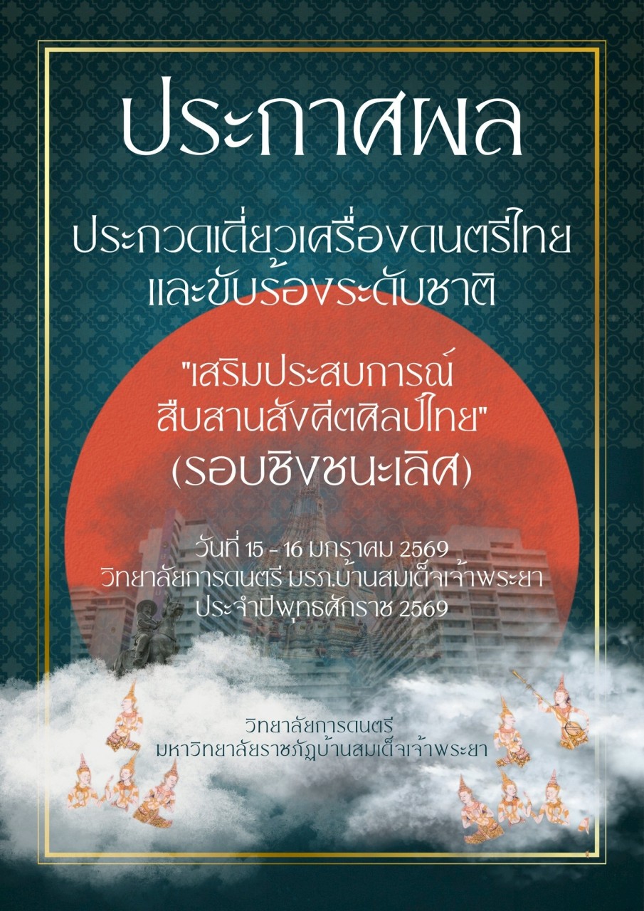 อาจารย์ ดร.สุณิสา ศิริรักษ์ พร้อมด้วย อาจารย์ ดร.ปริทัศน์ เรืองยิ้ม อาจารย์ประจำสาขาวิชาดนตรีไทยและดนตรีพื้นบ้าน คณะศิลปกรรมศาสตร์ มหาวิทยาลัยราชภัฏสงขลา (มรภ.สงขลา) นำตัวแทนนักศึกษาสาขาวิชาดนตรีไทยและดนตรีพื้นบ้าน เข้าร่วมการประกวดเดี่ยวเครื่องดนตรีไทยและขับร้องระดับชาติ “เสริมประสบการณ์ สืบสานสังคีตศิลป์ไทย” รอบชิงชนะเลิศ ระดับอุดมศึกษา เนื่องในโอกาสงานวันคล้ายวันพิราลัยสมเด็จพระยาบรมมหาศรีสุริยวงศ์ (ช่วง บุนนาค) ประจำปีพุทธศักราช 2569 จัดโดย วิทยาลัยการดนตรี มหาวิทยาลัยราชภัฏบ้านสมเด็จเจ้าพระยา (มรภ.บ้านสมเด็จเจ้าพระยา) ระหว่างวันที่ 15-16 มกราคม 2569 ภายใต้โครงการการสร้างมาตรฐานทางวัฒนธรรมดนตรีไทยเพื่อการเรียนรู้และเผยแพร่แก่เยาวชนในสถานศึกษาด้วยสื่อนวัตกรรม