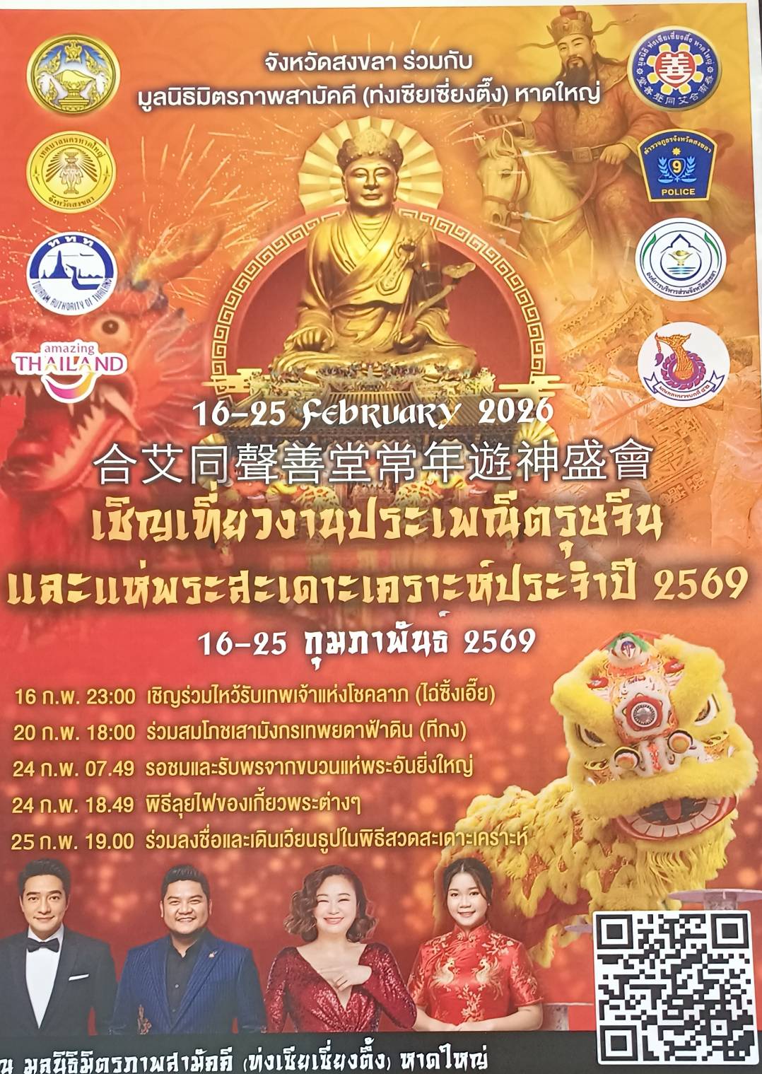 ทั้งนี้ มูลนิธิมิตรภาพสามัคคี (ท่งเซียเซี่ยงตึง) หาดใหญ่ ขอเชิญชวนประชาชนและนักท่องเที่ยวเข้าร่วมงาน ประเพณีแห่พระสะเดาะเคราะห์ ประจำปี 2569 ระหว่างวันที่ 16 – 25 กุมภาพันธ์ 2569 ณ บริเวณมูลนิธิมิตรภาพสามัคคี (ท่งเซียเซี่ยงตึง) หาดใหญ่ ถนนสวนหย่อมศุภสารรังสรรค์ เขตเทศบาลนครหาดใหญ่