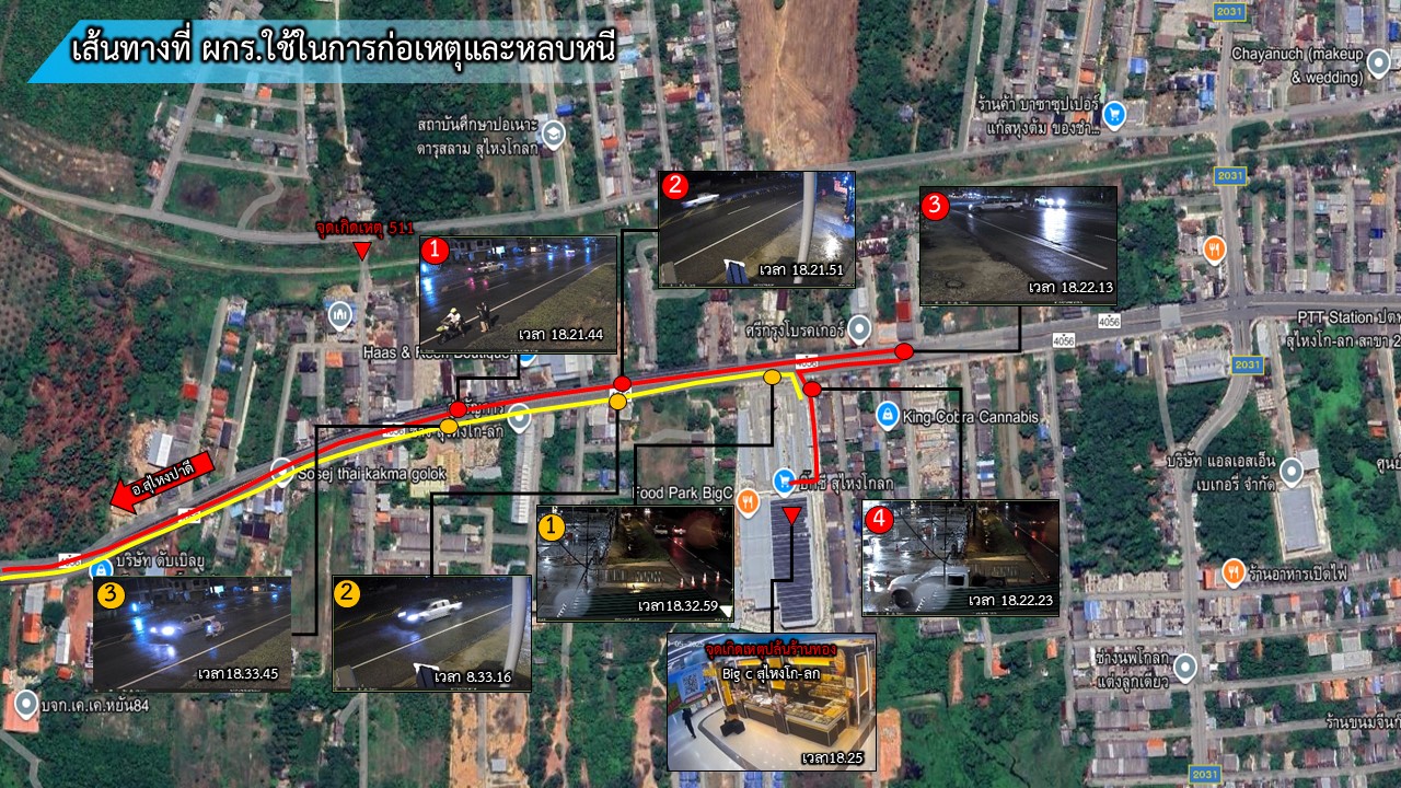 - คันที่ 1 เป็นรถยนต์ดีแม็ก สีบรอนซ์เงิน ทะเบียน กค 6521 นราธิวาส เกิดเหตุบ้านเลขที่ 277 หมู่ที่ 4 ตำบลปะลุรู อำเภอสุไหงปาดี จังหวัดนราธิวาส เหตุเกิดเวลาประมาณ 17.00 น.