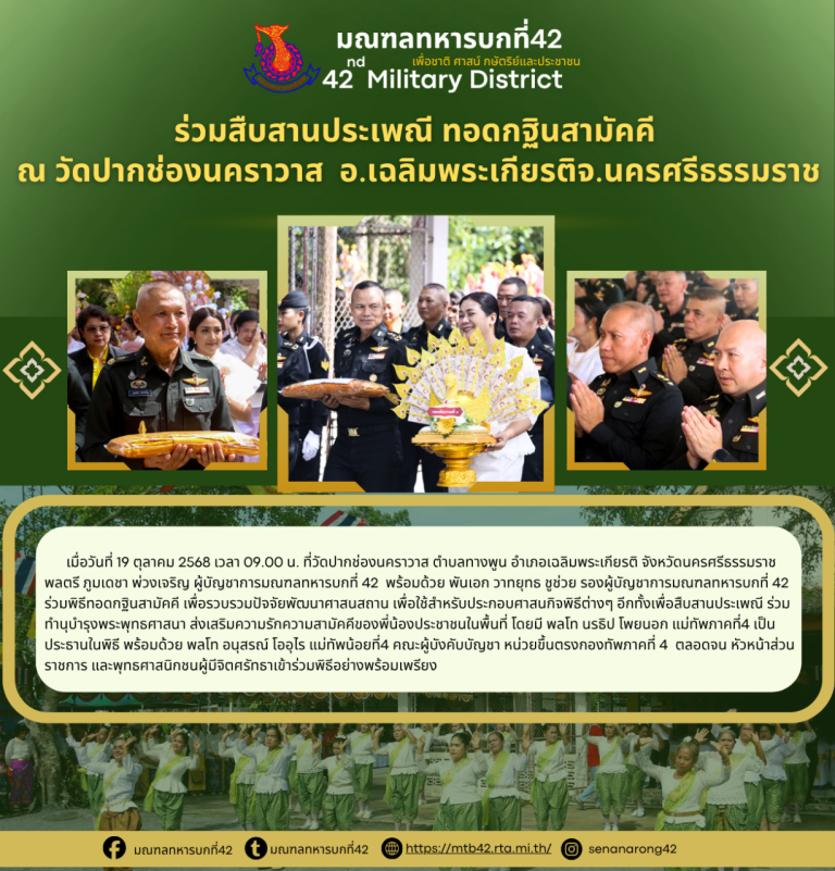 วันที่ 19 ตุลาคม 2568 เวลา 09:00 น. พันเอก ชาญฤทธิ์ ฮันสราช ผู้บังคับหน่วยเฉพาะกิจกรมทหารพรานที่ 43 ร่วมกับส่วนราชการในพื้นที่ ให้การต้อนรับ พลเอก ประวิตร วงษ์สุวรรณ หัวหน้าพรรคพลังประชารัฐ เป็นประธานในพิธีทอดกฐินสามัคคี ประจำปี 2568 เพื่อนำปัจจัยไปบูรณะปฏิสังขรณ์วัด อีกทั้งเป็นประเพณีสำคัญทางพระพุทธศาสนาที่พุทธศาสนิกชนชาวไทยได้ยึดถือปฏิบัติสืบทอดกันมาแต่โบราณ เพื่อถวายผ้ากฐินแด่พระภิกษุสงฆ์ที่จำพ