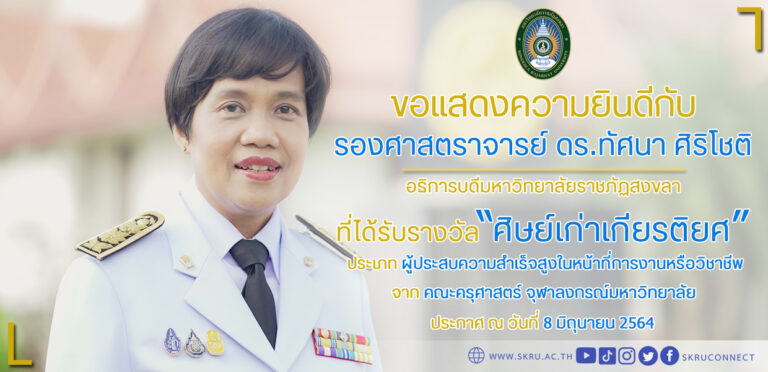 รศ.ดร.ทัศนา ศิริโชติ อธิการบดีมหาวิทยาลัยราชภัฏสงขลา (มรภ.สงขลา) ได้รับการคัดเลือกจากคณะครุศาสตร์ จุฬาลงกรณ์มหาวิทยาลัย รับโล่รางวัลศิษย์เก่าเกียรติยศ ประจำปี 2564 ประเภทผู้ประสบความสำเร็จสูงในหน้าที่การงานหรือวิชาชีพ ซึ่งคณะครุศาสตร์ จุฬาฯ มีนโยบายส่งเสริมและสร้างขวัญกำลังใจแก่ศิษย์เก่าที่สร้างชื่อเสียงและทำคุณประโยชน์ต่อวงการศึกษา ในโอกาสวันคล้ายวันสถาปนาคณะครุศาสตร์วันที่ 10 กรกฎาคม ของทุกปี โด