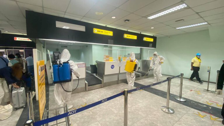 ท่าอากาศยานหาดใหญ่ ร่วมกับกองพลพัฒนาที่ 4 ค่ายรัตนพล ทำความสะอาดพร้อมฉีดพ่นยาฆ่าเชื้อในการป้องกันการแพร่ระบาดของโรคติดเชื้อไวรัสโคโรนา (COVID-19) บริเวณพื้นที่โดยรอบอาคารผู้โดยสาร ฯ