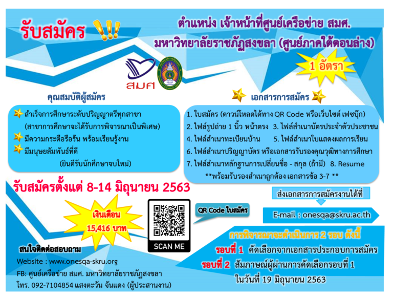 คณะครุศาสตร์มหาวิทยาลัยราชภัฏสงขลา (มรภ.สงขลา)เปิดรับสมัครเจ้าหน้าที่ประจำศูนย์เครือข่าย สมศ. มหาวิทยาลัยราชภัฏสงขลา (ศูนย์ภาคใต้ตอนล่าง) จำนวน 1 อัตรา เงินเดือน15,416บ