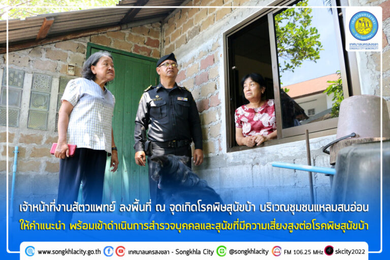 ทน.สงขลาร่วมกับเจ้าหน้าที่งานสัตวแพทย์ลงพื้นที่ ณ จุดเกิดโรคพิษสุนัขบ้า บริเวณริมชายหาดสมิหลา-ชลาทัศน์ ชุมชนแหลมสนอ่อน โดยเข้าดำเนินการสำรวจบุคคลและสุนัขที่มีความเสี่ยงสูงต่อโรค