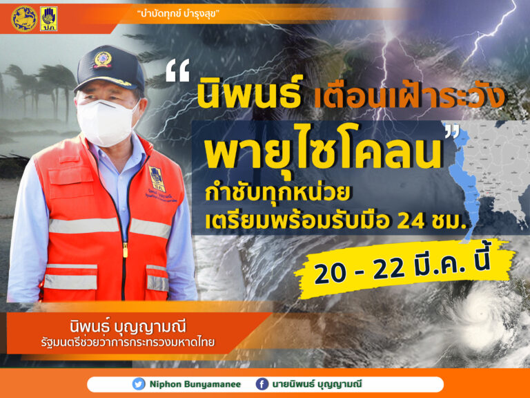 ‘นิพนธ์’ เตือนเฝ้าระวังพายุไซโคลน 20–22 มีนาคม นี้ กำชับทุกพื้นที่เฝ้าระวังและแจ้งเตือนประชาชน พร้อมรับมือตามแผนเผชิญเหตุ 24 ชม.
