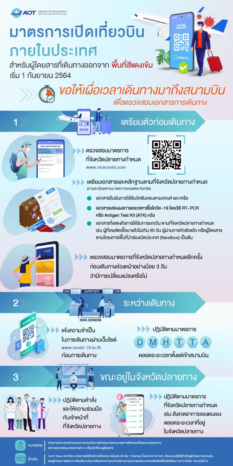 โปรดทราบ มาตรการเปิดเที่ยวบินภายในประเทศ สำหรับผู้โดยสารที่เดินทางออกจากพื้นที่สีแดงเข้ม เริ่ม 1 กันยายน 2564