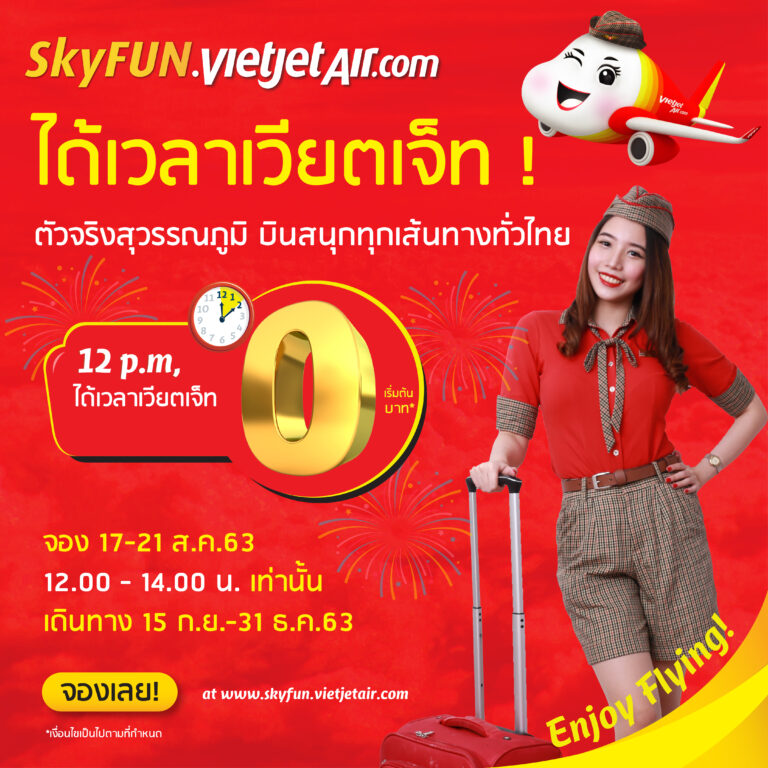 (กรุงเทพฯ, 12 กรกฎาคม 2563)–ไทยเวียตเจ็ทประกาศจัดโปรโมชั่นตั๋วเครื่องบินราคาสุดคุ้มอีกครั้ง กับโปรโมชั่น“ได้เวลาเวียตเจ็ท!”ตั๋วเครื่องบินราคาพิเศษเริ่มต้นเพียง 50 บาท (ไม่รวมภาษีและค่าธรรมเนียม) จำนวนมากกว่า 500,000 ใบสำหรับใช้เดินทางได้ตั้งแต่วันที่ 1 กันยายน 2563 – 30 มิถุนายน 2564 (ไม่รวมวันหยุดนักขัตฤกษ์) เปิดให้จองได้ 5 วันตั้งแต่วันที่ 13-17 กรกฎาคม 2563 ในช่วงเวลา 12:00 – 14:00 น. ที่เว็บไซ