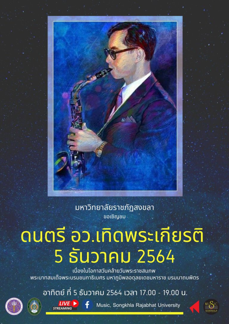 มหาวิทยาลัยราชภัฏสงขลา (มรภ.สงขลา) ขอเชิญชม“ดนตรี อว.เทิดพระเกียรติ 5 ธันวาคม 2564”ในวันอาทิตย์ ที่ 5 ธันวาคม 2564 เวลา 17.00-19.00 น. ผ่านทางLive Streaming on Fanpage: Music, Songkhla Rajabhat Universityเนื่องในโอกาสวันคล้ายวันพระราชสมภพ พระบาทสมเด็จพระบรมชนกาธิเบศร มหาภูมิพลอดุลยเดชมหาราช บรมนาถบพิตร โดยการแสดงดนตรีจากคณาจารย์และนักศึกษาสาขาวิชาดุริยางคศิลป์ตะวันตก คณะศิลปกรรมศาสตร์ มรภ.สงขลา