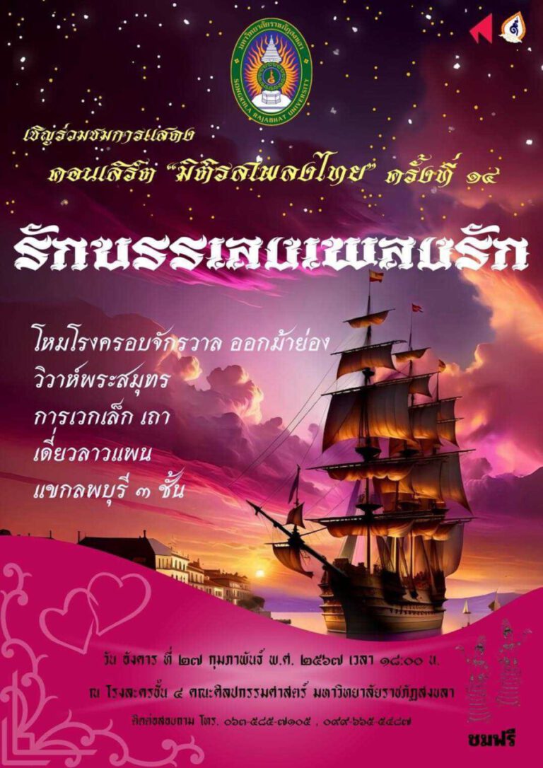 คณะศิลปกรรมศาสตร์ มหาวิทยาลัยราชภัฏสงขลา (มรภ.สงขลา) ขอเชิญร่วมรับชมการแสดงผลงานทางดนตรีไทย มิติรสเพลงไทย ครั้งที่ 14 “รักบรรเลงเพลงรัก” โดยนักศึกษาหลักสูตรศิลปกรรมศาสตรบัณฑิต สาขาวิชาดนตรีไทย คณะศิลปกรรมศาสตร์ มรภ.สงขลา ในวันอังคารนี้ (27 กุมภาพันธ์ 2567)ตั้งแต่เวลา 18.00 น. เป็นต้นไป ณ โรงละครวิจิตร จันทรากุล (โรงละคร ชั้น 4) คณะศิลปกรรมศาสตร์ มรภ.สงขลา