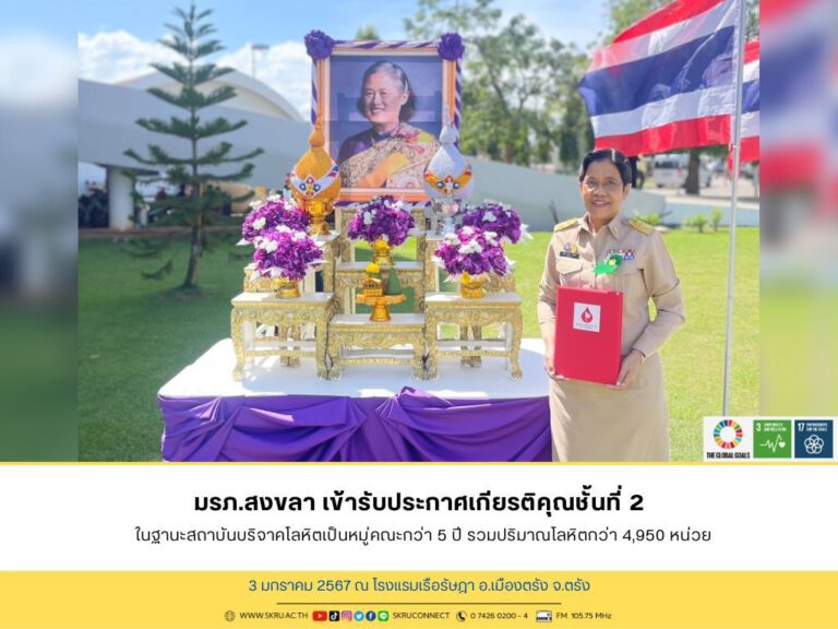 มรภ.สงขลา เข้ารับประกาศเกียรติคุณชั้นที่ 2 ในฐานะสถาบันบริจาคโลหิตเป็นหมู่คณะกว่า 5 ปี รวมปริมาณโลหิตกว่า 4,950 หน่วย