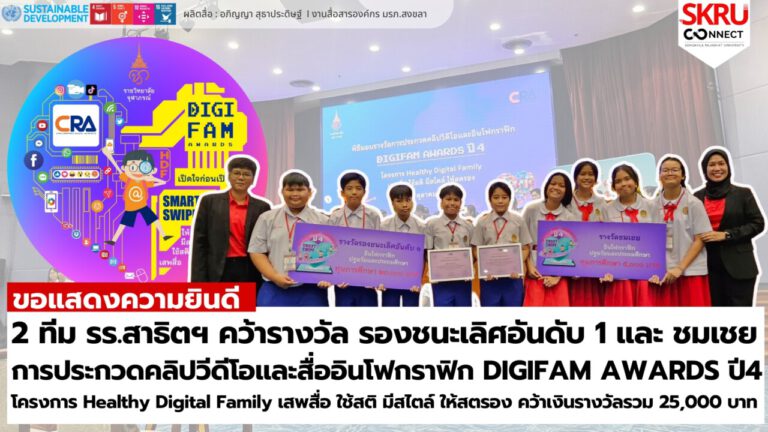 2 ทีม รร.สาธิต มรภ.สงขลา แทคทีมคว้ารางวัลรองชนะเลิศอันดับ 1 และ รางวัลชมเชย ประกวดคลิปวิดีโอและอินโฟกราฟิก DIGIFAM AWARDS ปีที่ 4 ระดับปฐมวัยและประถมศึกษา รับทุนการศึกษารวม 25,000 บาท