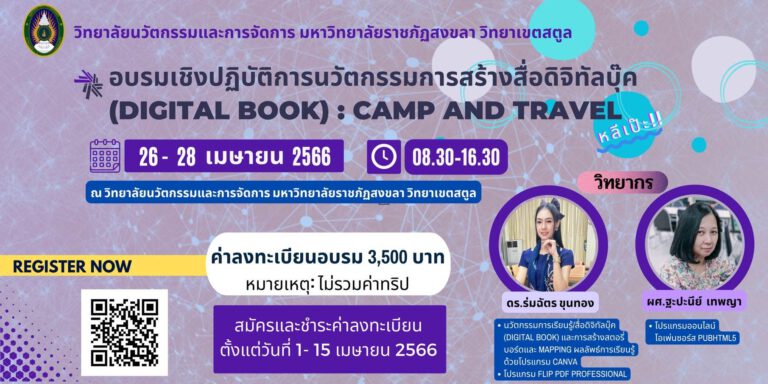 วิทยาลัยนวัตกรรมและการจัดการ มหาวิทยาลัยราชภัฏสงขลา (มรภ.สงขลา) วิทยาเขตสตูล ขอเชิญผู้สนใจเข้าร่วมโครงการอบรมเชิงปฏิบัติการนวัตกรรม“การสร้างสื่อดิจิทัลบุ๊ค (Digital Book) : Camp and Travel”ระห