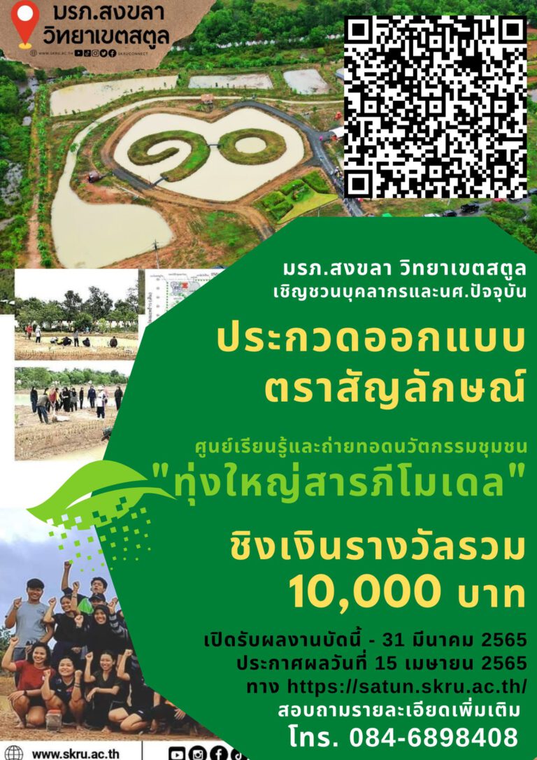มรภ.สงขลา วิทยาเขตสตูล ชวนบุคลากรและนักศึกษาปัจจุบัน ร่วมประกวดออกแบบตราสัญลักษณ์“ศูนย์เรียนรู้และถ่ายทอดนวัตกรรมชุมชนทุ่งใหญ่สารภีโมเดล”ชิงเงินรางวัลรวม 10,000บาท ส่งผลงานได้ตั้งแต่บัดนี้-31 มี.ค. 65