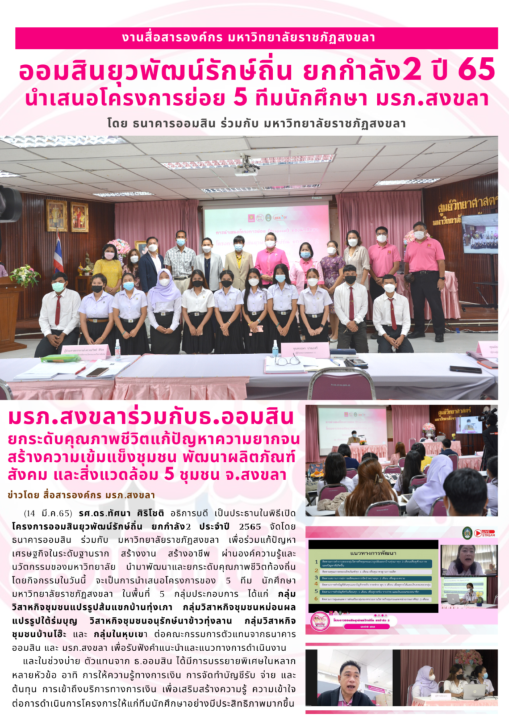 มรภ.สงขลา จับมือธนาคารออมสินทำโครงการออมสินยุวพัฒน์รักษ์ถิ่น ยกกำลัง 2 มุ่งแก้ปัญหาเศรษฐกิจระดับฐานราก สร้างอาชีพผ่านองค์ความรู้และนวัตกรรม ยกระดับคุณภาพชีวิตปูทางสู่ความเข้มแข็งชุมชน รศ.ดร.ทัศนา ศิริโชติ อธิการบดีมหาวิทยาลัยราชภัฏสงขลา (มรภ.สงขลา)เป็นประธานในพิธีเปิดโครงการออมสินยุวพัฒน์รักษ์ถิ่น ยกกำลัง 2 ประจำปี 2565 จัดโดยธนาคารออมสิน ร่วมกับ มรภ.สงขลาณ ห้องประชุม อาคารศูนย์วิทยาศาสตร