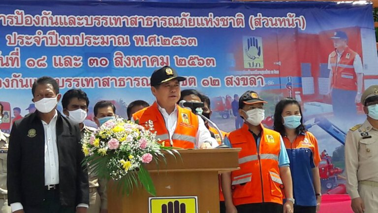 มท.2 ชมการสาธิตการฝึกระดมทรัพยากร 3 สถานี และปล่อยขบวนทรัพยากรกู้ภัย จำลองสถานการณ์หากเกิดอุทกภัย ภัยระดับ 3 โดยจัดตั้งกองบัญชาการป้องกันและบรรเทาสาธารณภัยแห่งชาติ (ส่วนหน้า) จังหวัดสงขลา