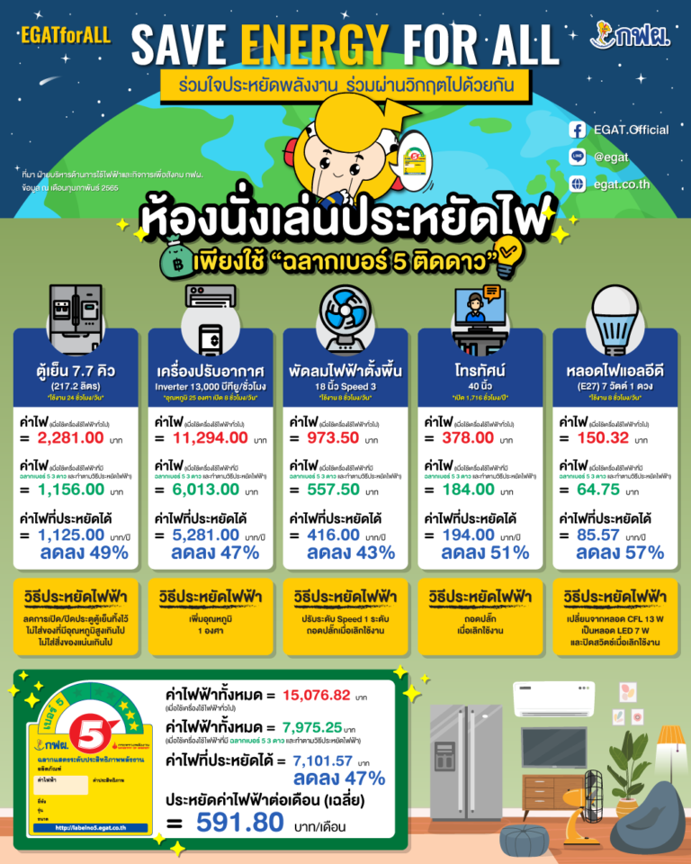 รู้หรือไม่ หากเลือกใช้เครื่องใช้ไฟฟ้าที่มีฉลากประหยัดไฟฟ้าเบอร์ 5 ★★★ 3 ดาว แทนเครื่องใช้ไฟฟ้าที่ไม่มีฉลากประหยัดไฟฟ้าในห้องนั่งเล่นและทำตามวิธีประหยัดไฟฟ้า จะช่วยประหยัดเงินค่าไฟฟ้าได้กว่า 7,101.57 บาท/ปี.1.